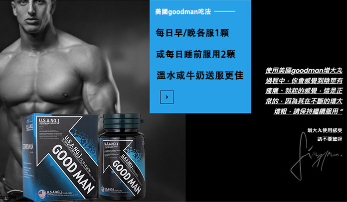 美國GOODMAN增大丸是來自美國Naspacin Maker藥廠的男性專用保健品,以天然、安全、有效為核心理念,針對陰莖短小、勃起不堅、早洩、性慾低下等常見男性困擾,提供科學化的解決方案。產品融合深海鯊魚睪丸萃取物、L-精胺酸與多種草本精華,具備增大、增粗、助勃、延時、補腎強精等多重功效,是目前市面上少數同時具備陰莖外型改善+性功能強化效果的男性複合配方保健品之一,深受全球使用者信賴與推薦。