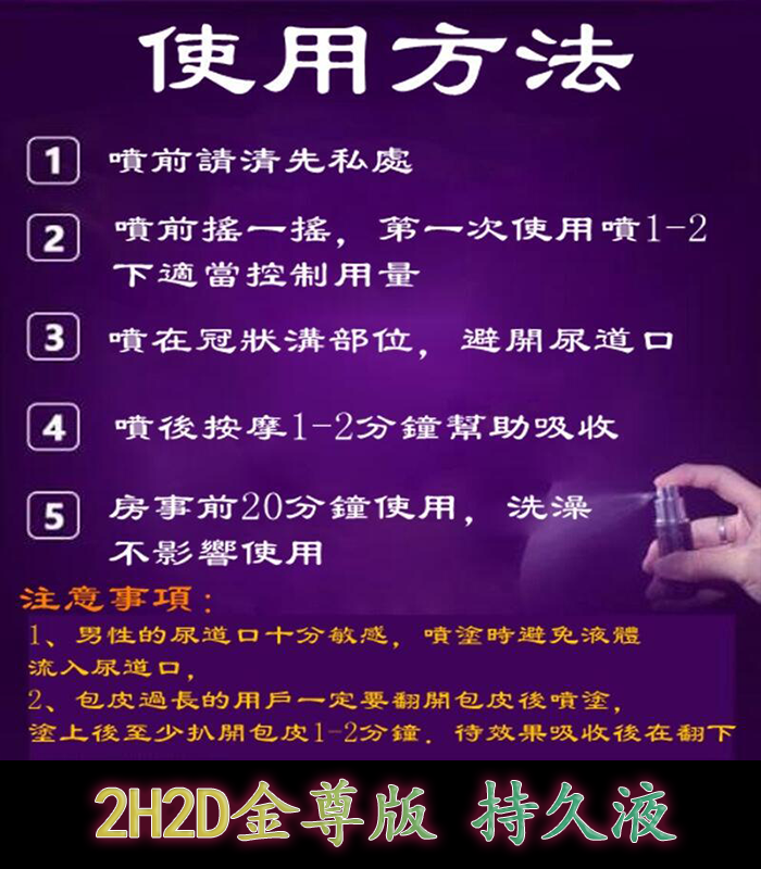 - 使用步驟:在預計性愛前10-15分鐘,將持久液均勻塗抹於陰莖頭部及周圍區域,輕輕按摩至完全吸收。等待效果發揮後即可進行性愛活動。