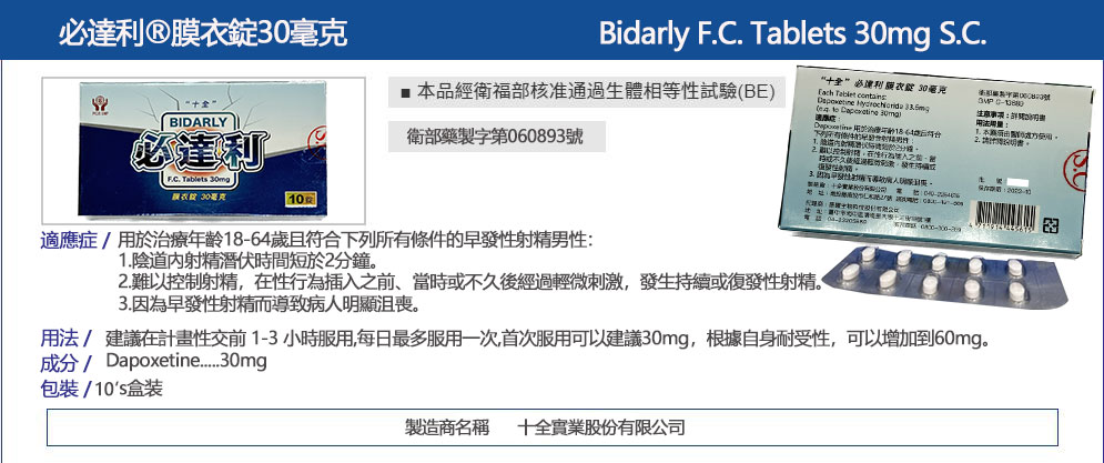 成分含量:Dapoxetine 達泊西汀 30毫克
