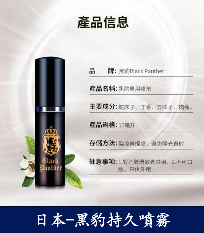 | 中文名 | 黑豹持久液 | 健保局衛生許可證號 | (2201)第1648號 | ||