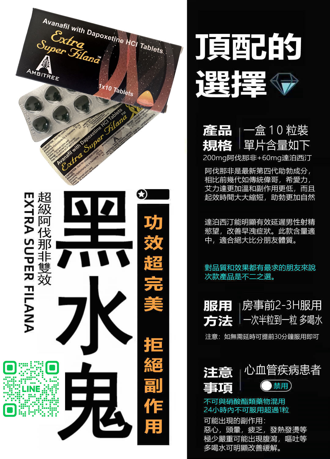 超級黑水鬼(Extra Super Filana) 結合兩大關鍵成分:阿伐那非(Avanafil) 與 達泊西汀(Dapoxetine),同步解決「硬度不足」與「過快射精」兩大問題,是目前市面上極具代表性的雙效型男性壯陽藥。