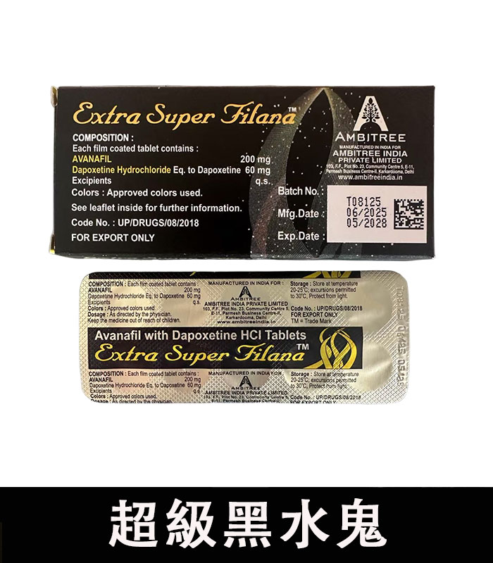 超級黑水鬼 Extra Super Filana 是一款專為男性打造的雙效壯陽藥,結合強力成分 阿伐那非(Avanafil) 與 達泊西汀(Dapoxetine),可同步改善 勃起功能障礙(ED) 與 早洩(PE),有效延長性愛時間、提升勃起硬度與穩定度,幫助男性恢復信心與性生活品質。