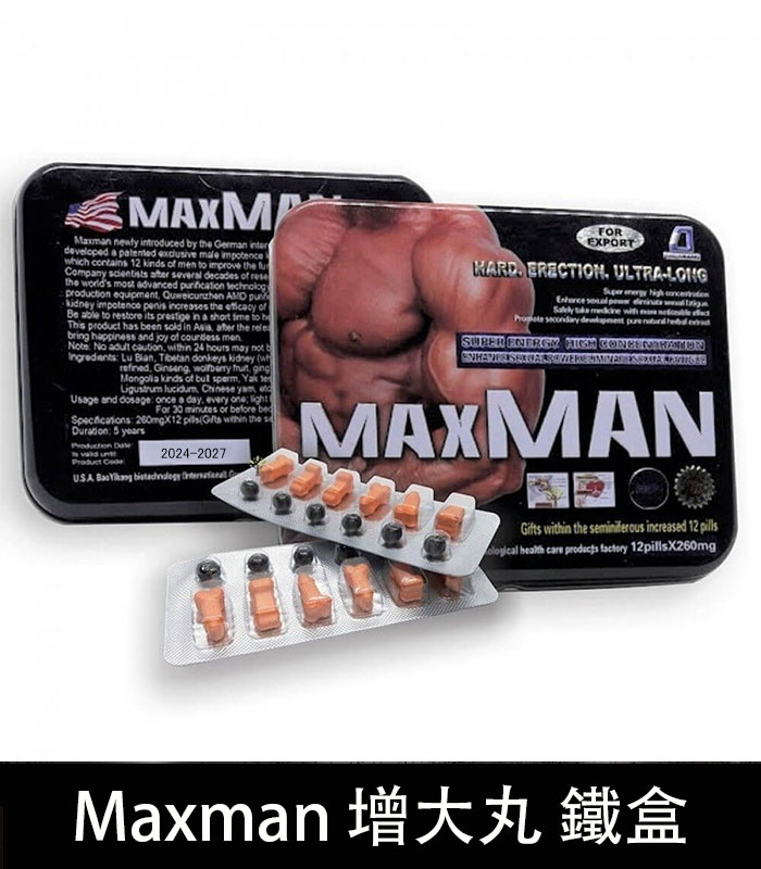 Maxman二代增大丸鐵盒加強版採用海拔3000米以上的瑪卡、刺五加、黃精、鎖陽子、西洋參等多種稀有植物精華製成,無任何添加劑。該配方能夠修復陰莖海綿體細胞、提升增大增粗效果,並對睾丸、精囊及前列腺提供保護。其作用包括增大陰莖、延長性生活時間、改善早洩問題,並提高性能力,使用安全無副作用。