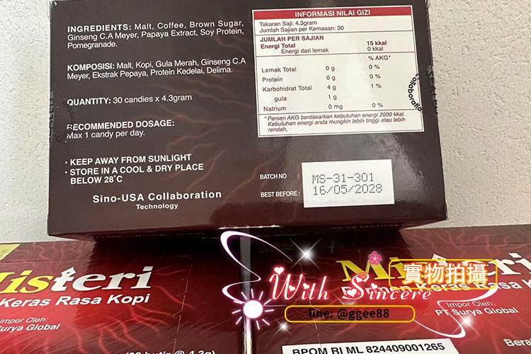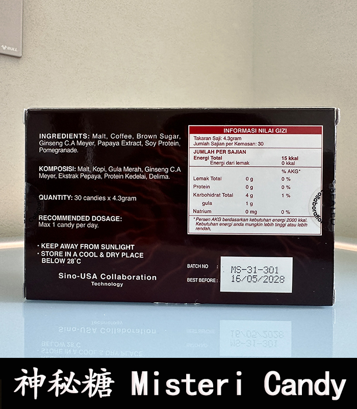 Misteri Candy 神秘糖(印尼版汗馬糖)不僅延續經典的草本壯陽補腎配方,更在原料選擇與成分比例上全面升級,讓每一顆糖都蘊含強效的精力滋補力量。由馬來西亞原廠嚴格監製,採用獨立鋁箔密封技術鎖住新鮮與活性成分,全程冷鏈運輸確保品質如初。無論是日常保養還是臨時加強,神秘糖都能為你帶來 3–5 天的持久動能與自信表現。