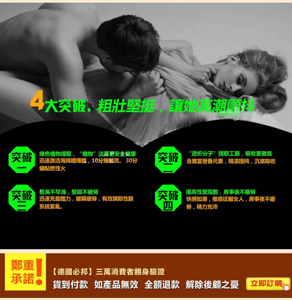 第一階段:壹柱擎天 一顆見效,吃後25分鐘左右起效 輕度患者第壹天服用植物WG就能重燃欲望,陰莖持久勃起!