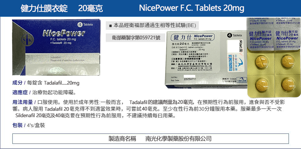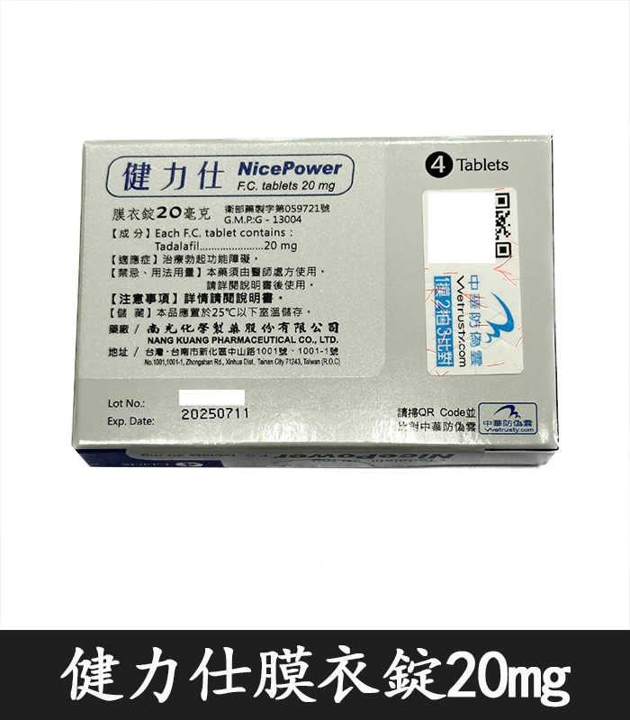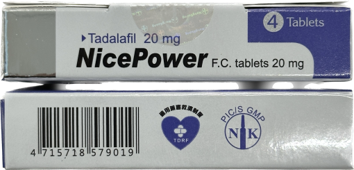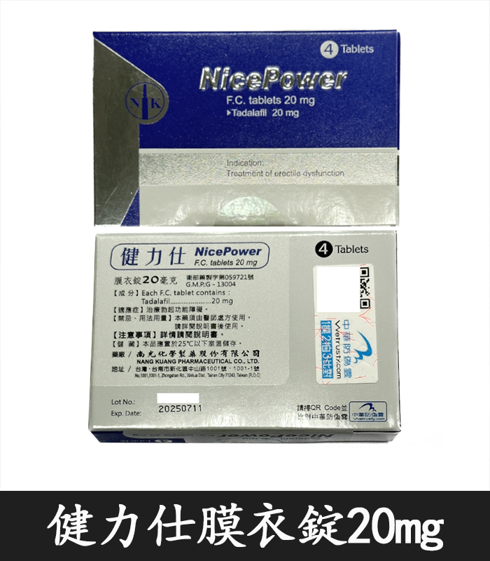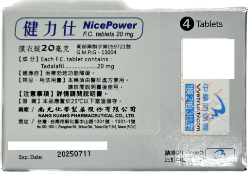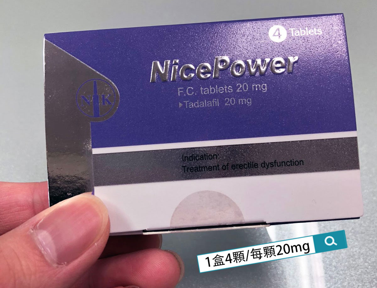 • 每盒含 4 錠 健力仕膜衣錠 NicePower 20mg,每錠含 20mg Tadalafil(犀利士成分)。