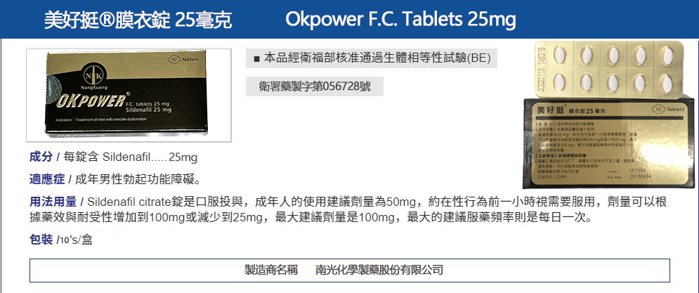 首頁 商品列表 壯陽藥 威而鋼 美好挺 OKPOWER 25mg 膜衣錠|輕劑量 Sildenafil 10顆裝