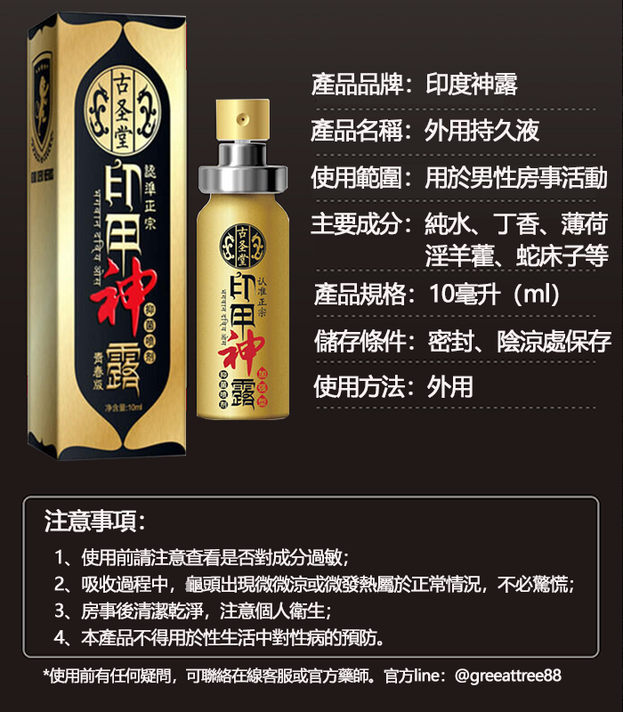 印度神露持久液屬於男性外用延時噴劑。可有效的緩解男性出現的不硬、時間短、不舉等現象。