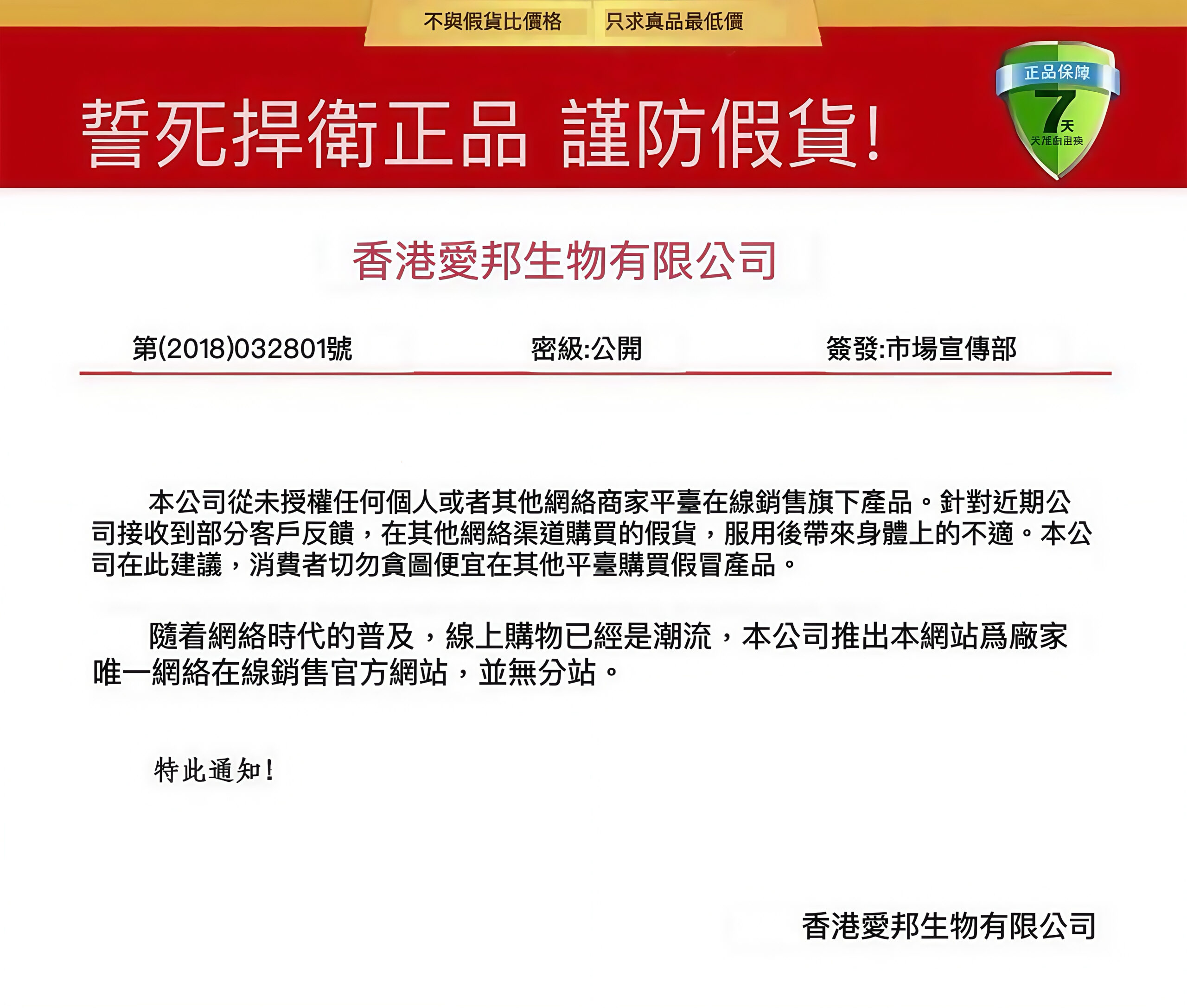 正品保證:產品由香港愛邦生物科技有限公司生產,經權威認證及嚴格質量監控,請從授權渠道購買,以確保產品真偽及使用安全。