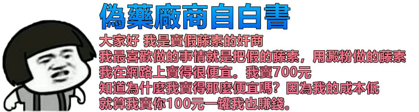 朋友們,我來告訴你們一件非常重要的事情,那就是關於假藥、僞藥的問題。有一些商家為了欺騙消費者,常常使用低價的套路來銷售假藥。比如我曾經在蝦皮網上看到最低價的藤素賣到了700元,而在網店上通常都是1200元或1300元,甚至更低,還出現了“買一送一”、“買二送二”、“買三送三”的極低價格。大家動動腦筋想一想,這會是真正的正品嗎?感覺好像是免費送給你一樣。為什麼會這麼便宜呢?其實原因很簡單,就是因為賣的是假藥,製造成本非常低。可能別人生産一瓶的成本還不到50元呢。所以民眾們,我們一定要擦亮眼睛,遠離假藥僞藥,保護我們自己的健康。記住,價格過低的東西很可能是假的,一定要去正規的藥店或者是醫院購買藥品,這樣才能保證我們的安全和健康。
